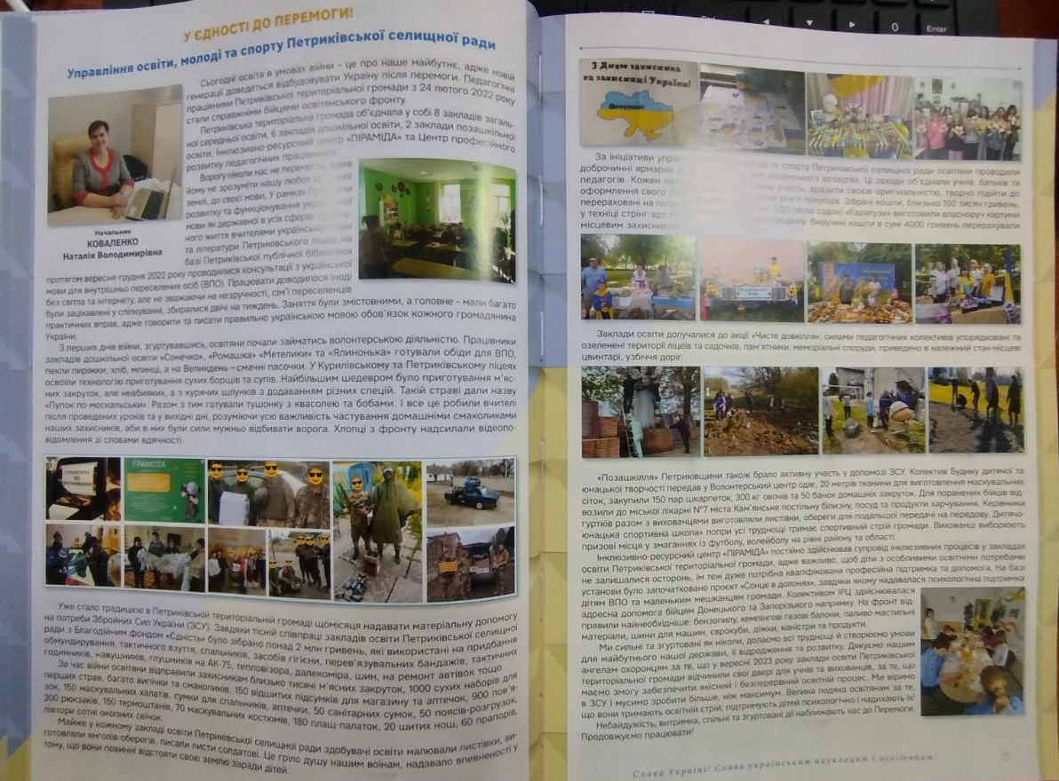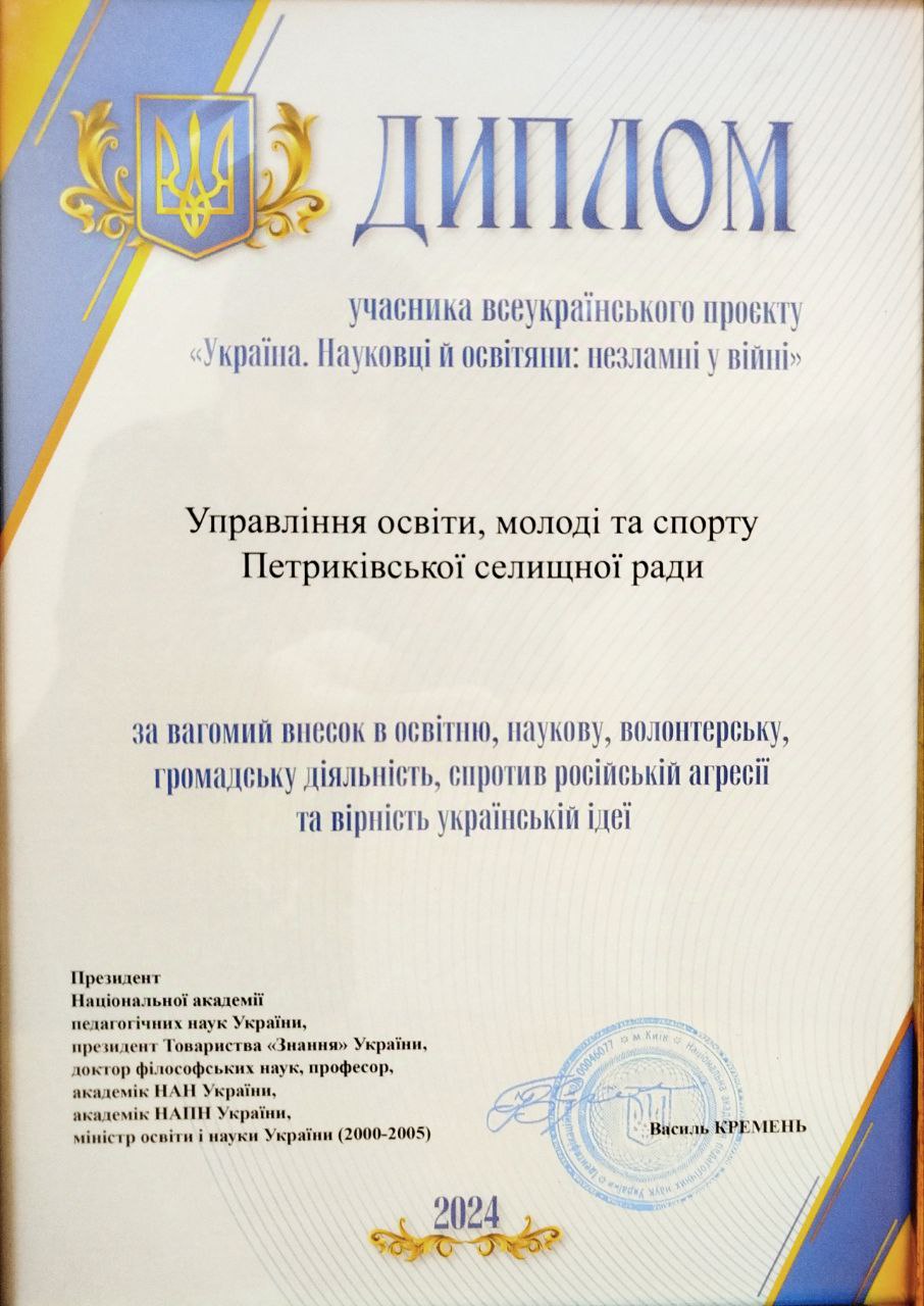 Беручи участь у цьому проєкті, освітяни Петриківської громади отримали Диплом учасника Всеукраїнського проєкту. Нашу статтю було надруковано у книзі «Україна. Науковці й освітяни: незламні у війні». Публікація статті та нагорода відзначають наш вагомий внесок в освітню, волонтерську та громадську діяльність, спротив російській агресії та вірність українській ідеї. Ми горді, що діяльність освітян Петриківської громади під керівництвом начальника управління освіти Наталії Коваленко відзначена в національному збірнику.